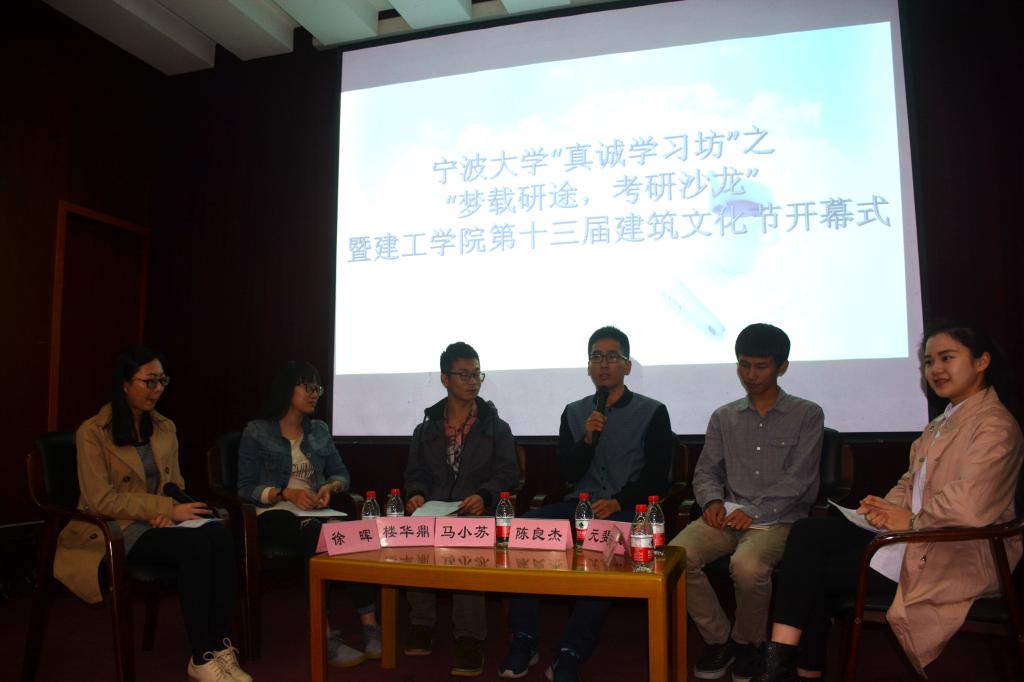 4月22日晚,建工学院考研座谈会暨第十三届建筑文化节开幕式在建工学院报告厅举行,考研座谈会邀请了马小苏、徐晖、楼华鼎、陈良杰和元斐斌等同学就考研保研问题进行探讨,建工学院一百多名学生参加了本次开幕式。