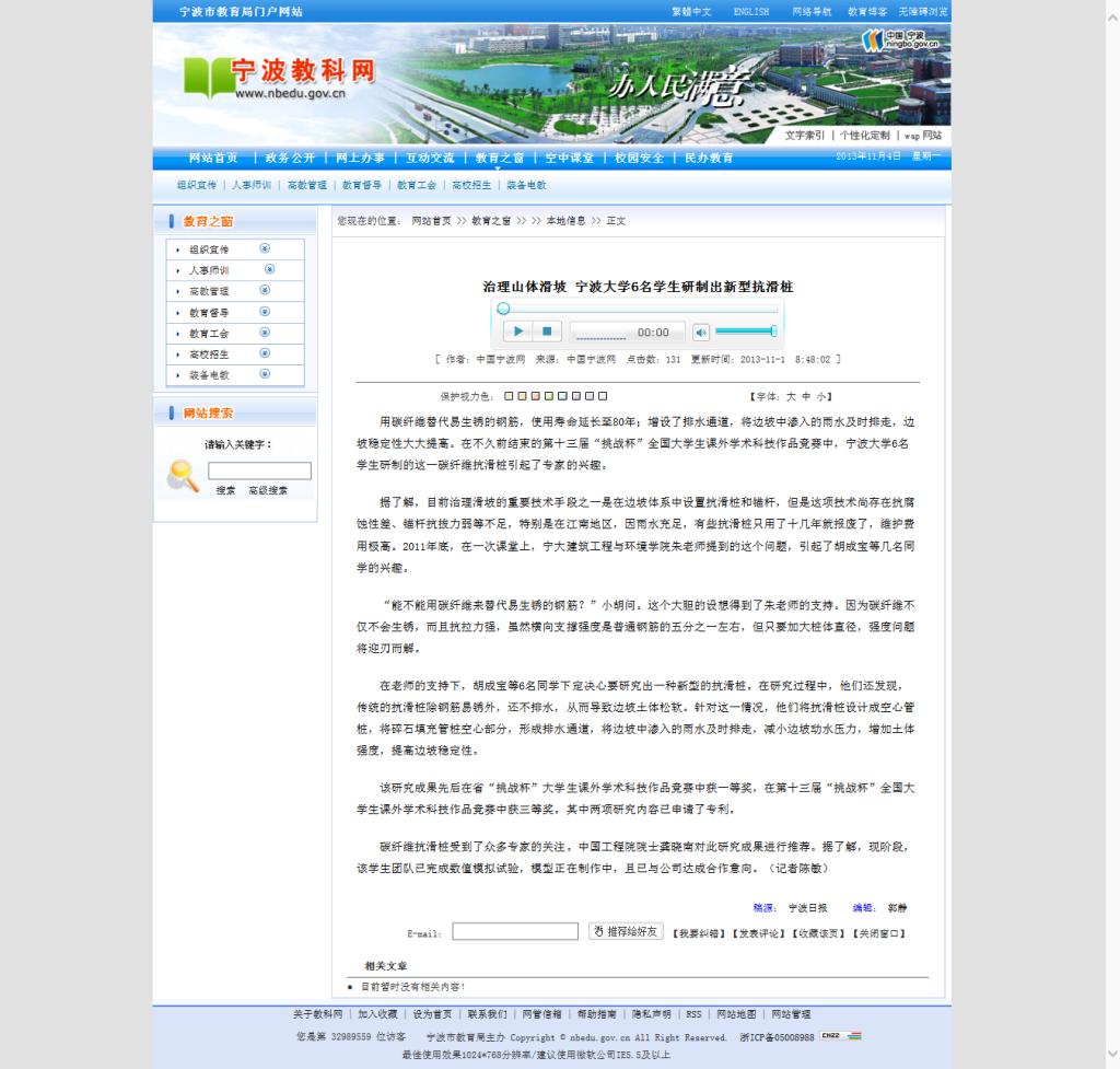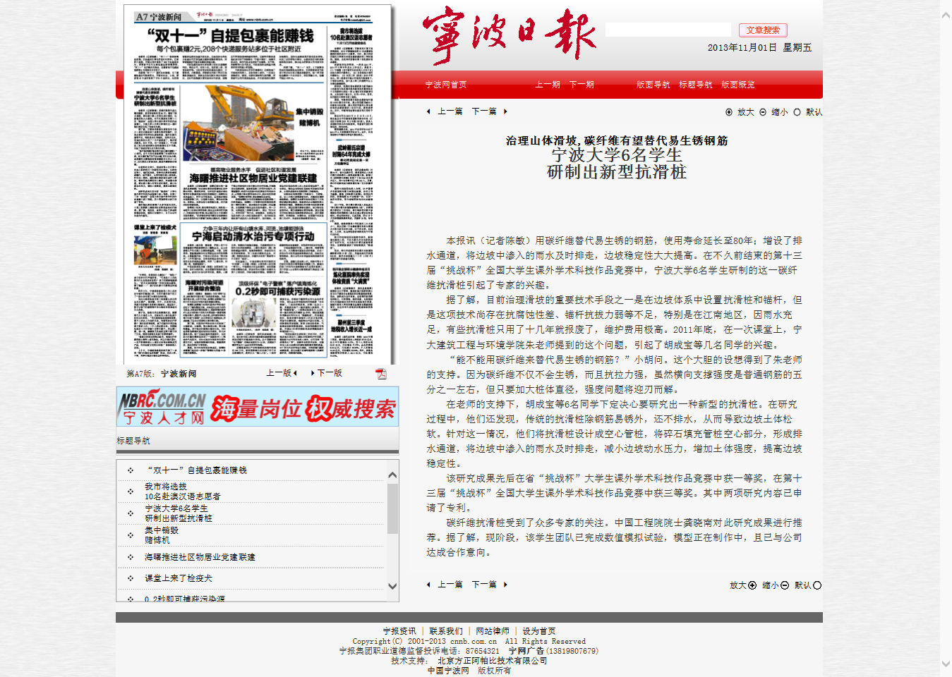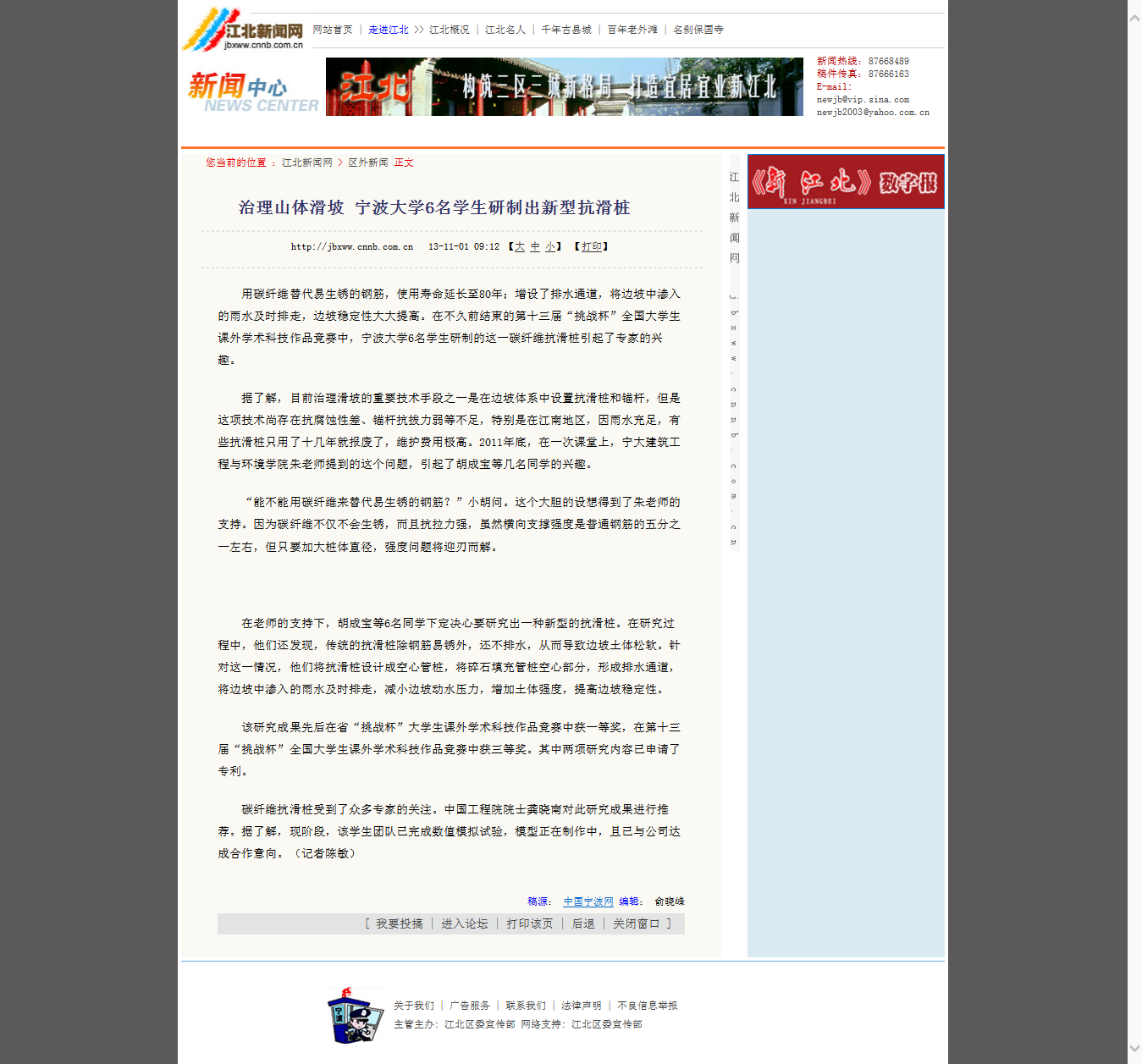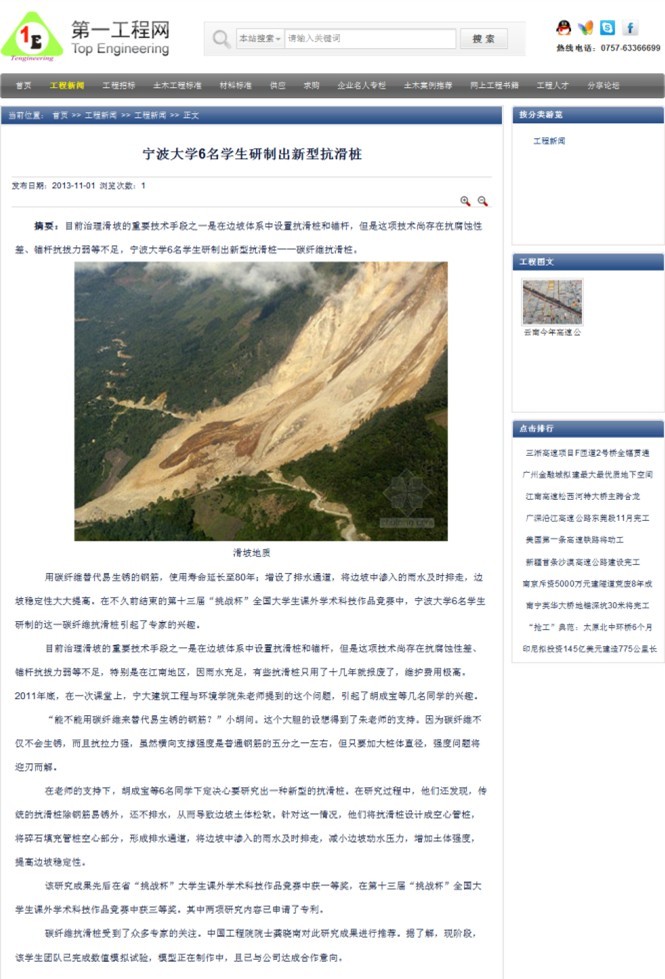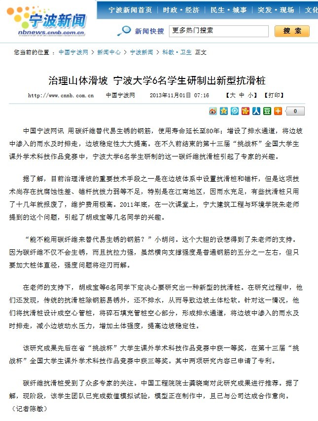 学子的作品所带来的影响仍在持续发酵。截止到目前,已有宁波日报等大众媒体对本作品及其创作团队进行详细报道,更有凤凰网、中国岩土网、宁波市科技信息网、天津网、长春科技网等进行转载报道。而宁大建工学子研制出新型抗滑桩的消息更是不胫而走,引起整个公众的注意;并且已有相关企业就作品与其团队接洽。