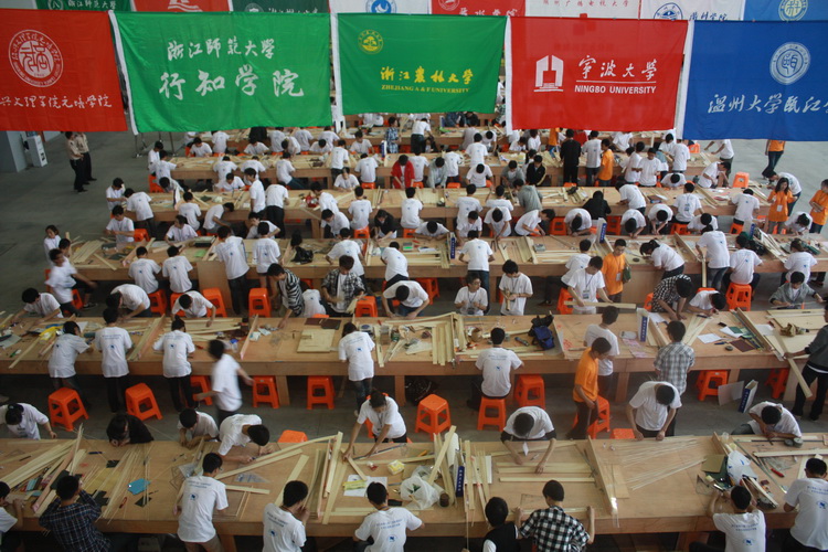 本次竞赛在比赛模式上采取了新颖的探索与尝试,打破了以往参赛队伍携带模型直接参赛的方式,采取将参赛队员集中在组委会指定的场所,统一在规定的时间内独立完成模型制作。这在一定程度上对参赛选手提出了更高的要求,增强了比赛的公平和公正。为能在此次比赛中获得好的成绩,我校曾在4月份通过举办校第十届大学生结构设计竞赛作了校内选拔,并确定了5支队伍参加浙江省第十届大学生结构设计竞赛。之后,5支队伍在建工学院相关教师的指导下,依托我校省级结构设计实践教学基地,进行了为期一个月的强化训练,通过大量实验和测试,有效提高了作品质量。