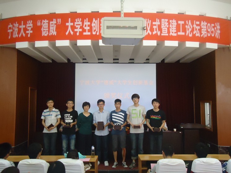 “德威”大学生创新基金奖励名单。德威董事长刘艳森女士为获奖同学颁奖。随后,获奖学生代表,工管07班高炎同学作了发言。最后,郑荣跃院长发表了讲话。郑院长对浙江德威支持学校办学事业表示感谢,并对获得本次创新基金的同学表示祝贺。