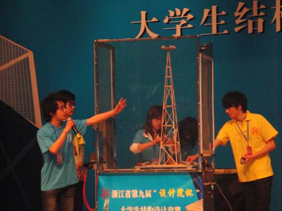 本届大学生结构设计竞赛题目为动力结构模型设计与制作,要求每个参赛队设计和制作一个高层模型,并承受一定的基础动力作用。制作材料为组委会指定的木材和502胶水。竞赛中,通过加载砝码和模拟地震的形式提供动力作用,来测试高层结构模型。为能在此次比赛中获得好的成绩,我校曾在3月份通过举办校第九届大学生结构设计竞赛作了校内选拔,并确定了5支队伍参加浙江省第九届大学生结构设计竞赛。之后,5支队伍在建工学院相关教师的指导下,依托我校省级结构设计实践教学基地,进行了为期一个月的强化训练,通过大量实验和测试,有效提高了作品质量。