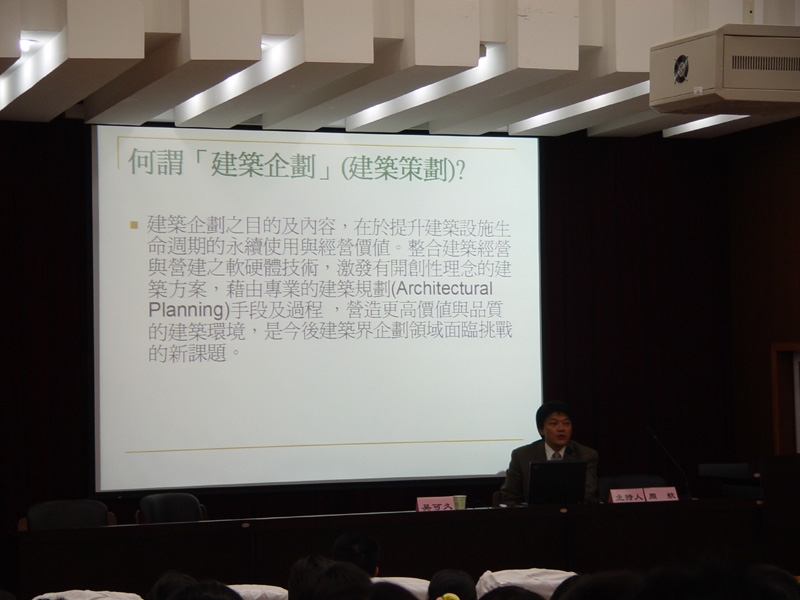 报告中,吴可久博士就建筑企划与技术、物业管理及设施管理展开了经济学、社会学及技术等方面的论述,同时分析了台湾大学学生宿舍策划等实际案例,介绍了台湾及各国的物业管理的发展概况与现状。