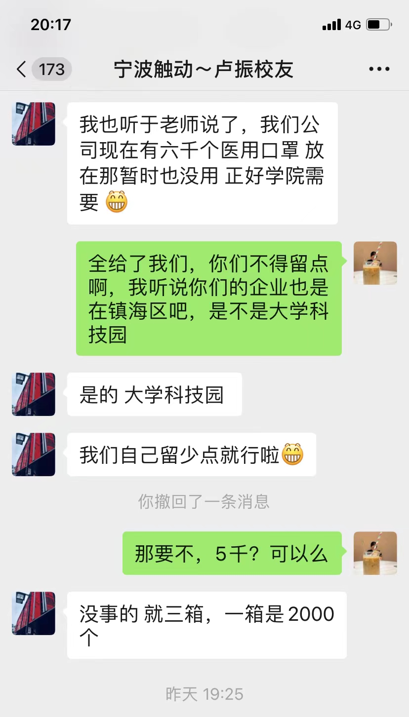 卢振先生多年来一直关心和支持学校的发展。在了解到学校近期正经历封控管理、学弟学妹们急需口罩后,第一时间通过副院长于旭彪联系到校内值守人员,将原本单位留用的6000只口罩倾囊相赠,为将风险降到最低,还独自搬运、驾车,送达学校。