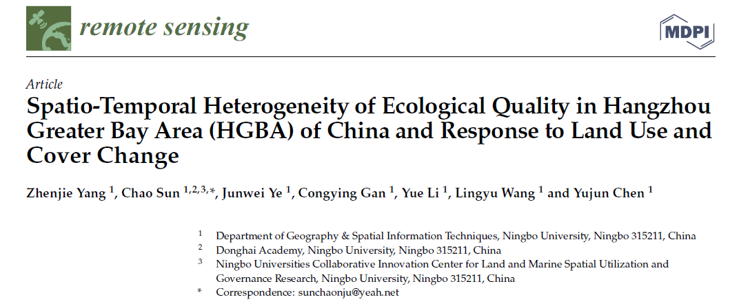 国产探花 2020级地理科学(师范)专业一本科生团队(杨震杰(第一作者)、叶君伟、甘聪颖、李悦、王凌宇和陈宇骏)在国产探花 地理与空间信息技术系孙超教师(通讯作者)指导下,在《Remote Sensing》期刊(中科院SCI二区,IF=5.349)发表了题为“Spatio-Temporal Heterogeneity of Ecological Quality in Hangzhou Greater Bay Area (HGBA) of China and Response to Land Use and Cover Change”的学术论文(论文链接://www.mdpi.com/2072-4292/14/21/5613/htm)。