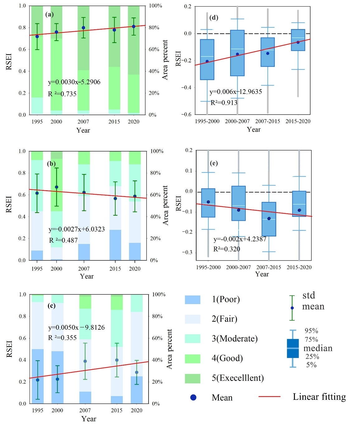 近年来,生态文明建设成为我国特色社会主义事业的重要内容,国家对于生态环境保护工作日益重视。当前,遥感技术以其快速、及时、大范围监测等优势被广泛应用于生态环境监测领域,例如徐涵秋提出的遥感生态指数(RSEI)可以直观客观评估生态环境。针对当前RSEI相关研究较少涉及群生态质量分异及其与土地利用变化的反馈机制,该研究以杭州湾大湾区为研究区建立遥感生态指数评估模型,监测近30年来湾区城市群的生态质量演变及其时空分异特征,深入挖掘区域生态质量与土地利用转化的定量关系。在RSEI的构建过程中,提出了一种百分位去噪归一化方法,克服了大范围区域噪声遍布的问题,使得基于RSEI的生态质量评估具备不同时期可比性。