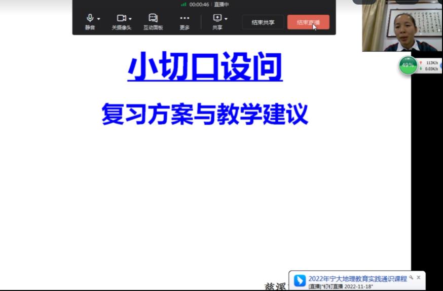 下午第二场教研活动由浒山中学的潘爱丽老师主讲,主题为小切口设问复习方案与教学建议,以2022年6月的浙江高考卷为例,从命题方向、复习方案、教学建议三个方面展开,并提出相应的教学建议。下午第三场教研活动由余姚四中的鲁凌云老师主讲,关于提高读图能力提出了若干教学建议,以2022年6月高考卷的最后两道读图选择题为示范,结合平时的教学经验,提出若干教学建议。