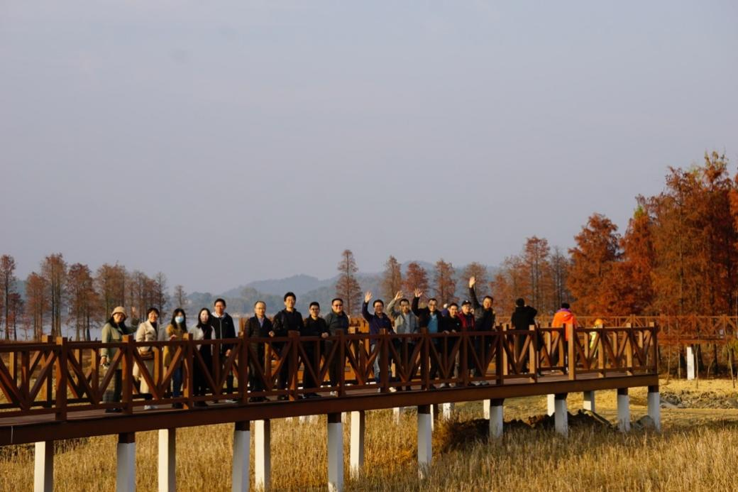 本次活动的最后一站是四明湖水杉林。水杉林位于四明湖的西南侧。入冬时节,这湖畔的水杉仿佛是大自然打翻的颜料盘,嫣红一片,美得让人心醉。“潦水尽而寒潭清,烟光凝而暮山紫。”群山连绵,水天一色。在这苍茫天地之间,水杉娉婷而立,火焰般的针叶如同天边簇簇云霞,温暖着每个人的心。师生在此稍作观光游憩,将本次活动推到了尾声。