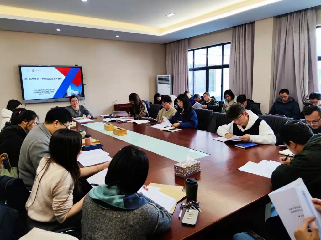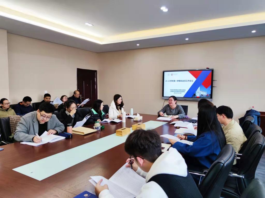 12月29日下午三点,学院21年下半年班主任工作会议在植物园校区行政楼318顺利举行,学院党委副书记朱剑琼主持会议,学院全体班主任和辅导员参加会议。