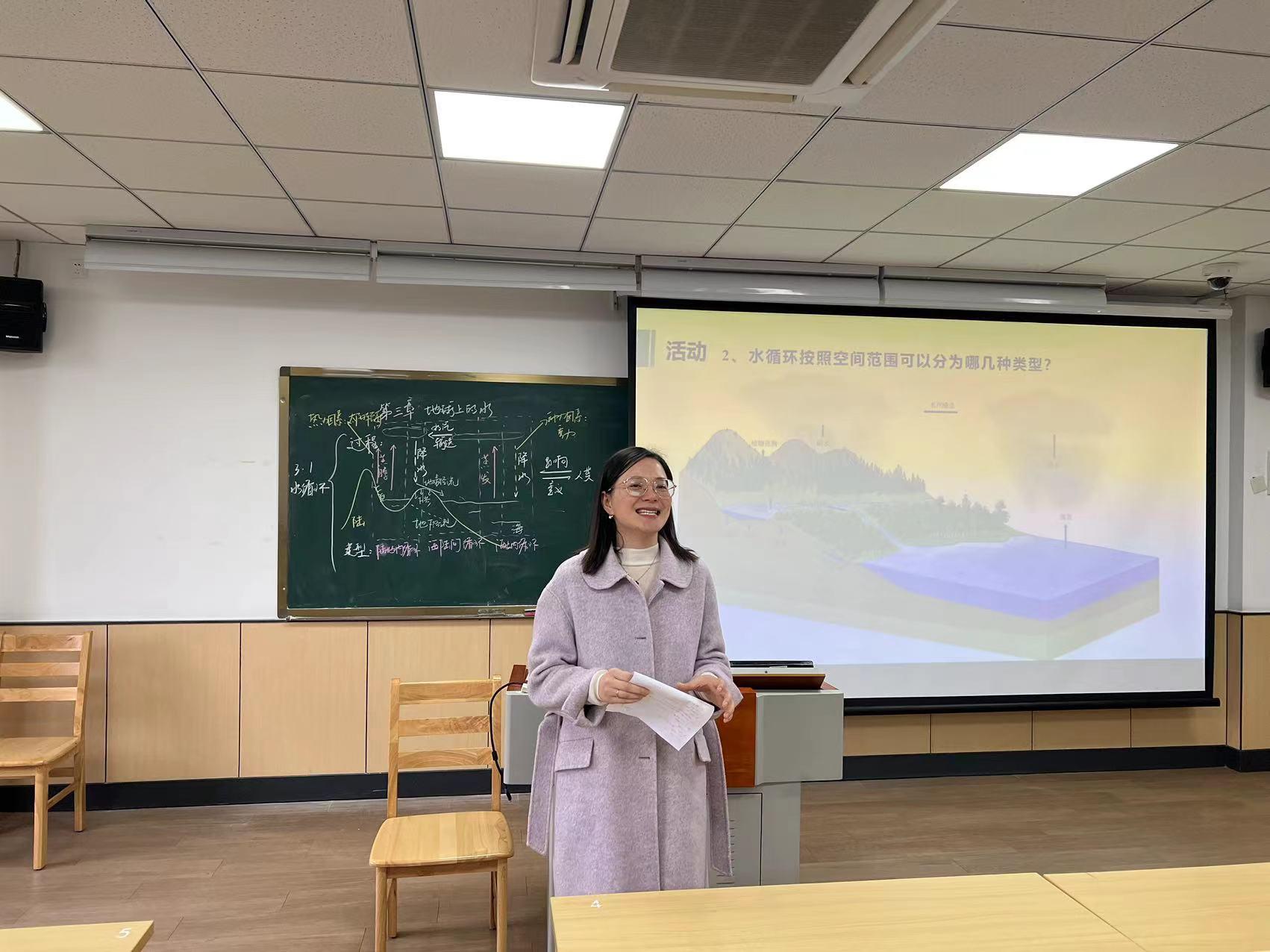 讲课结束后,两位导师在表达了对其授课风格、内容的赞赏之后,又提出了对于本节课基于自身经验的改进建议。周红星老师强调中学老师在课堂教学过程中要注重对学生地理实践力的培养和落实,譬如在水循环这一章节的授课过程中,可以尝试让学生自主设计、完成水循环模拟实验,通过真切地体验,锻炼学生的思维敏性和试错改进的实践能力。而虞文君老师则指出,新手老师在落实知识点的同时需要努力建设高效率的课堂,合理的运用图象、表格和数据将信息具象化,从而激发学生思维。除此之外,教师要从知识以及认知两个维度把握学生的学情,将地理的“道”和教学的“术”有机融合,进而创造出极具美感的地理课堂。