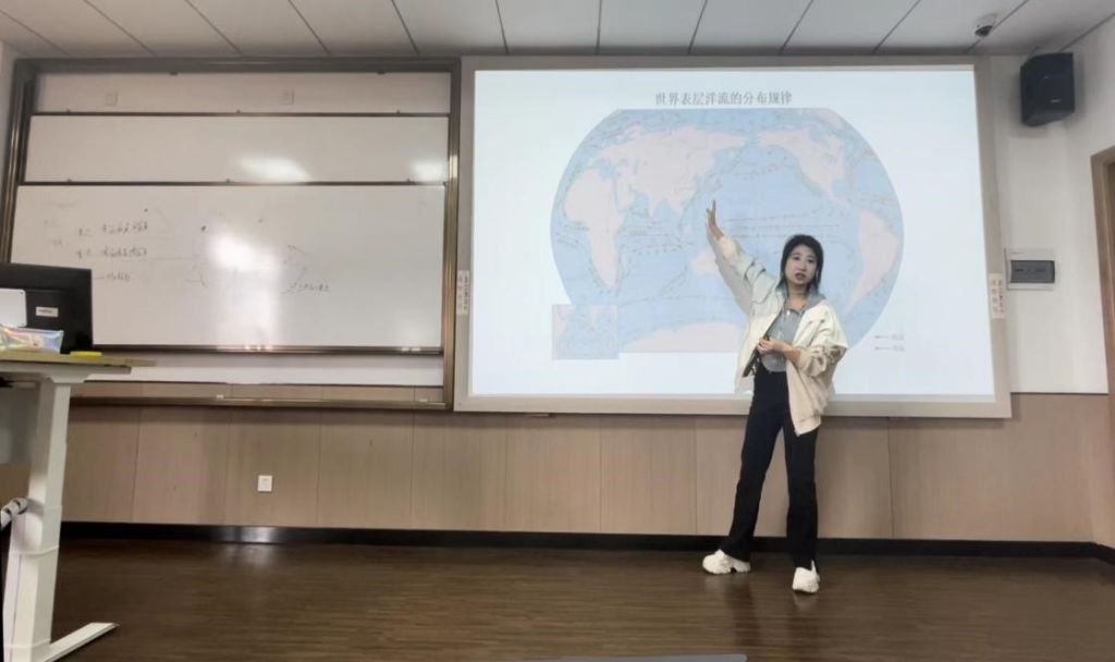 教师教育学院的研究生胡书琦学姐在课前为同学们准备了导学案——世界地图,借日本排放核污水一例导入课程,并核污水的轨迹预测引出洋流的定义、形成因素。胡学姐在授课过程中提出“8/0”洋流结构的记忆口诀,并利用导学案配合板画,设计了课堂互动环节,以帮助学生深化理解记忆。最后回顾课前案例分析洋流对人类生活的影响,强调了对于学生人地协调观的培养。