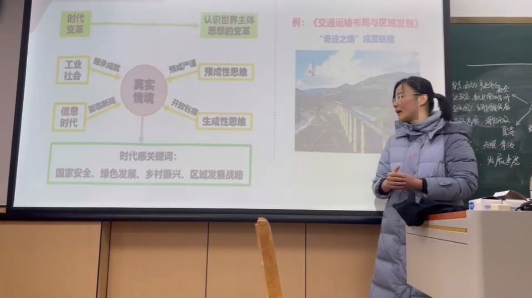 讲课结束后,陈老师还向同学们传授了十分宝贵的地理教学相关经验和技巧。其中重点分享了《基于地理思维课堂构建的有效情境创设》,指出地理课堂要创设时代感、主线式、多层次、冲突性、多样化的情境。