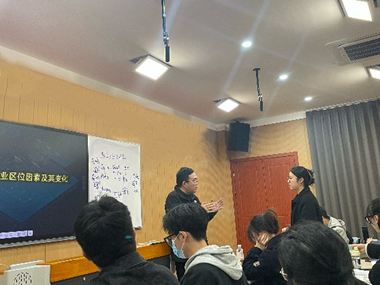 签约仪式结束后,龙赛中学董海峰老师为同学们带来了一堂精彩绝伦的《服务业区位因素及其变化》课。董老师以开设店铺为情景,让学生们自主讨论在何处开什么店,由此帮助学生认识到服务业的区位因素。此外,董老师引用身边的案例——在宁大步行街开小吃店,向学生们重点阐释了集聚因素对服务业区位选择的影响。本堂课教学设计环环相扣,课程内容衔接自然,课堂氛围民主和谐。各位师范生在课后向董老师请教了诸多关于教学的问题,受益匪浅。