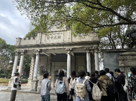 到达学校门口后,宁波四中张晓芳副校长、地理教研组长吴芳老师、朱希老师、江杉老师等热烈欢迎了大家的到来,并和大家一起合影留念。张校长向同学们介绍了宁波四中的悠久历史和地理学科的发展情况,接着,吴老师带领我们参观了校园,尤其是校园中复刻的老校门——原“浙东中学”校门,还简单介绍了本校的天文活动,校园中的一草一木都体现了宁波四中的历史底蕴和办学特色。