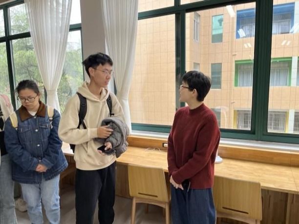 鄞江中学党委书记张力老师、地理教研组组长王玲老师等热烈欢迎了大家的到来,并一同与大家合影留念。随后,同学们跟随王玲老师开始参观校园,在地理活动室内,王老师向大家一一介绍陈列的地理教具以及学生们的地理手工作品;在艺术藏品展览厅里,沈炜慧老师对每一幅水彩、水墨画和书法作品都展开细致的描述;在图书馆、阅览室中,王老师亲切地与我们谈起鄞江中学学生的日常作息时间。简短的校园参观在不知不觉中便拉近了同学们与鄞江中学的距离,使大家快速融入其中。