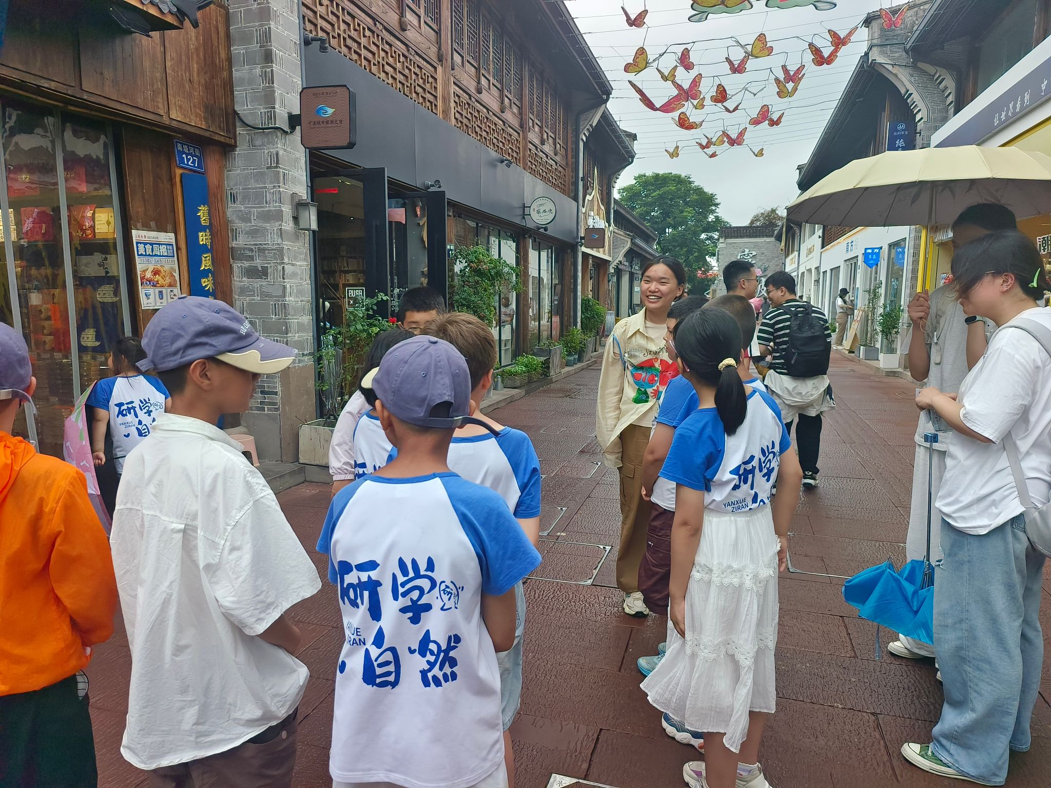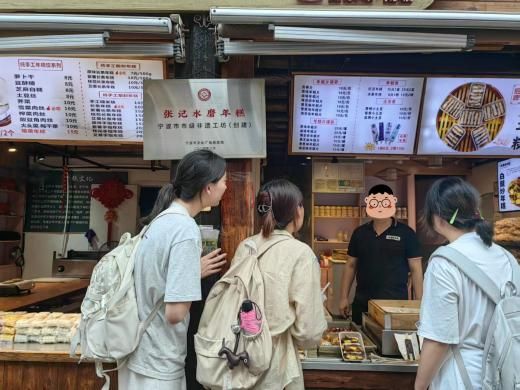 午饭过后,同学们分组开展调研活动,主要通过实地考察、商户访谈和问卷调查,了解南塘老街的配套基础设施情况、店铺业态业务情况、不同时段的客流量等等。调研发现,南塘老街的非遗商户较多,包括缸鸭狗、赵大有等中华老字号,以及白族扎染、德化瓷烧制等国家级非遗项目。北街以“时尚夜经济”为定位,引入Times咖啡馆、后备箱集市等新业态,形成“白天品古韵、夜晚享潮流”的消费场景。2024年春节假期,街区营业额达1455万元,同比增长17.22%,印证了业态创新的市场成效。调研过程中,同学们还偶遇了从新疆来宁波研学的小学生,小朋友对老街的美食与文化给予了肯定。