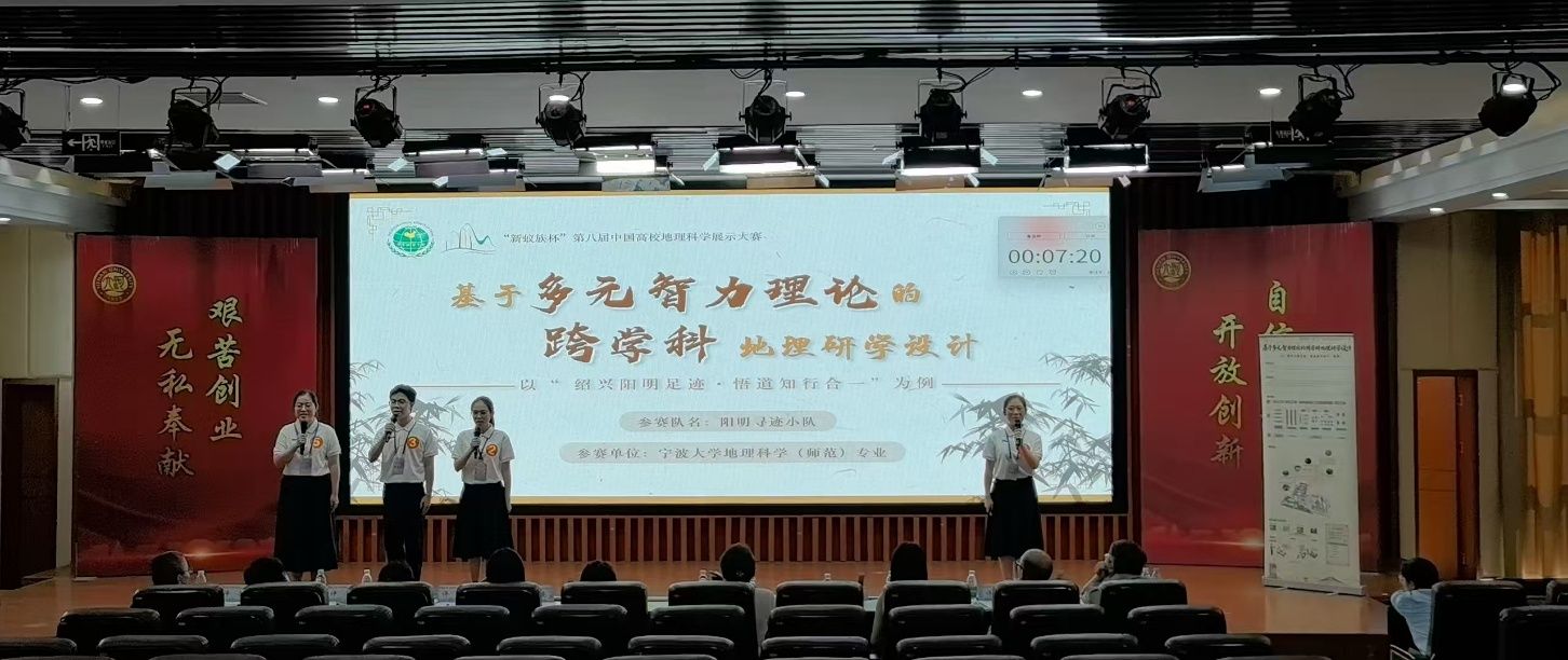 本届大赛以“美丽中国建设和地理学”为主题,地理科学(师范)23级、24级共15名学生组建三支队伍,在地理与空间信息技术系多位教师全程指导下参加了本次比赛,共斩获国家级奖项3项。由刘永超副研究员和李加林教授指导的“共生空间研究组”获自然地理组一等奖,由许洺山副教授和杨晓东教授指导的“黄迹寻踪”队荣获自然地理组二等奖;由马仁锋教授、陈妤凡讲师、高兴川副教授指导的“阳明寻迹”队斩获人文地理组一等奖。