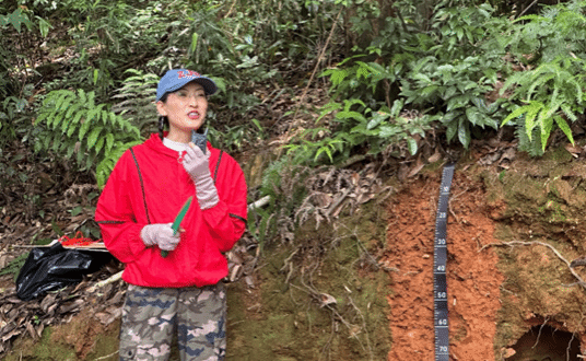 随后我们在沿路观察到了成片的裸露土壤剖面,便开展分层采集土壤剖面的活动。天童山主要以山地黄红壤为主,是红壤到黄壤的过渡类型。黄红壤主要成土过程是淋溶作用和脱硅富铝铁化作用,其典型的土壤结构是A(腐殖质层)-BC(过渡层)-C(母质层)。在高梅香老师的讲解与演示下,我们充分了解了此处黄红壤剖面的基本特征,并使用土壤剖面尺做整体剖面测量,用参考比例尺等工具观察观察微形态(如蚂蚁巢穴),最后自下而上完成土壤剖面样本分层采集并做相关记录。