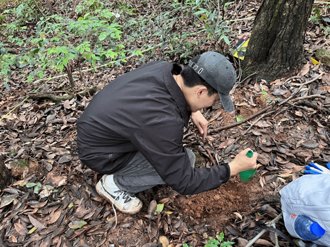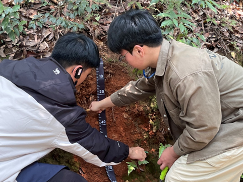 2025年5月24日上午,2023级地理科学(师范)在高梅香、杨晓东、罗旭、许洺山、夏然等老师及地理学研究生的带领下,前往宁波天童国家森林公园开展为期一日的《土壤与生态》课程野外实习。同学们在老师的引导下开展了分层采集土壤剖面、采集土壤分析样品、调查植物群落和制作植物标本等活动。在实习中,同学们将课内知识转化为立体知识,将天童山装进背包,诠释了宁大地理人致知于行的探索精神。