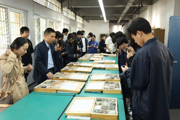 西校区载物楼前集合,开启了研学之旅的第一站——地理实验室群。在徐皓老师的引导下,学生们依次参观了地质陈列室、土壤地理实验室、微体古生物实验室、毕业论文答辩现场、虚拟仿真实验室等教学与科研场所,观察了岩石标本与地形模型,辨认了地理实验仪器,感受了答辩现场的学术氛围。徐皓老师和地理系学生详细讲解了各实验室与教室的情况,并介绍了各实验仪器的用途。