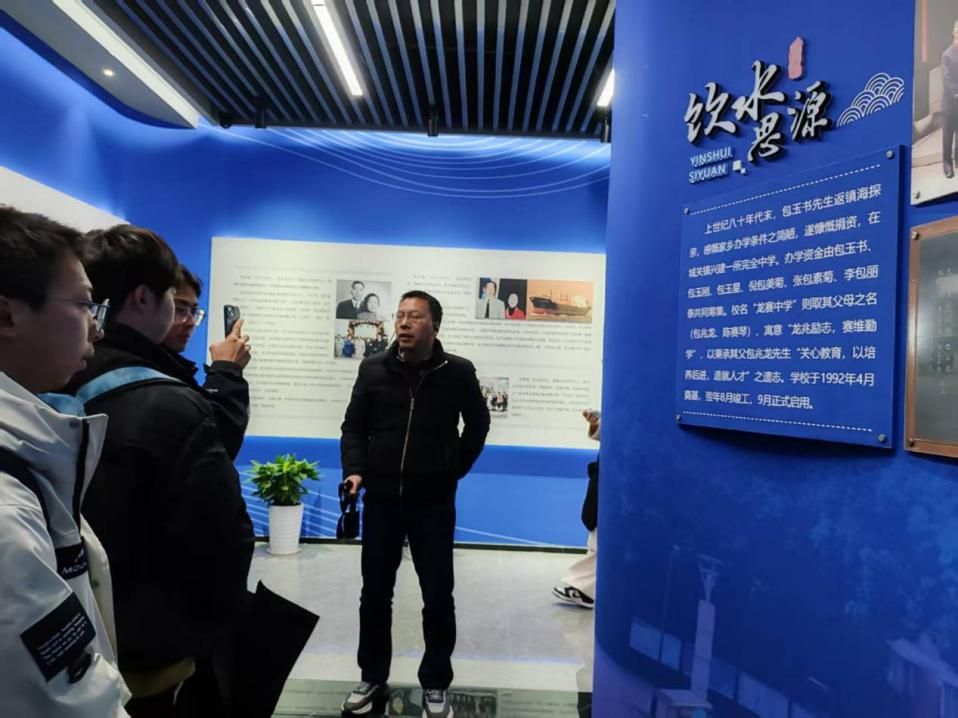 校史馆内,杜校长为我们娓娓道来龙赛中学的历史。1993年,包玉刚与胞兄包玉书、胞弟包玉星及三位姐妹张包素菊、李包丽泰、倪包美菊共同捐资兴建龙赛中学。校名“龙赛”取自其父包兆龙与母亲陈赛琴名字中的各一字,既是对父母的纪念,也寄托了“赛过前人、追求卓越”的期望。龙赛中学的校训是“励志、勤学、健身、友爱”,体现了包氏家族“以成长为中心”的教育观,强调全面发展与终身成长。包氏家族对龙赛中学的支持并非一次性捐资,而是代际延续的长期承诺,例如,2007年学校晋升为省一级重点中学后,包氏家族捐资设立“包氏奖教奖学基金”,激励师生发展。2023年建校30周年庆典上,家族代表包文骏(包玉刚之孙)出席并揭幕“包氏家族群像浮雕”,强调将传承“爱国爱乡、热心公益”的家风,持续支持学校发展。它们不仅是捐资者的纪念碑,更是一座精神丰碑——见证着“商行四海”与“心系故土”的辩证统一,诠释着“教育兴,则民族兴;根系深,则文明盛”的永恒真理。这种跨越百年的教育情怀,恰如宁波三江口的潮水,在代际接力中奔涌向前,将一座中学的命运,写进了民族复兴的壮阔叙事。