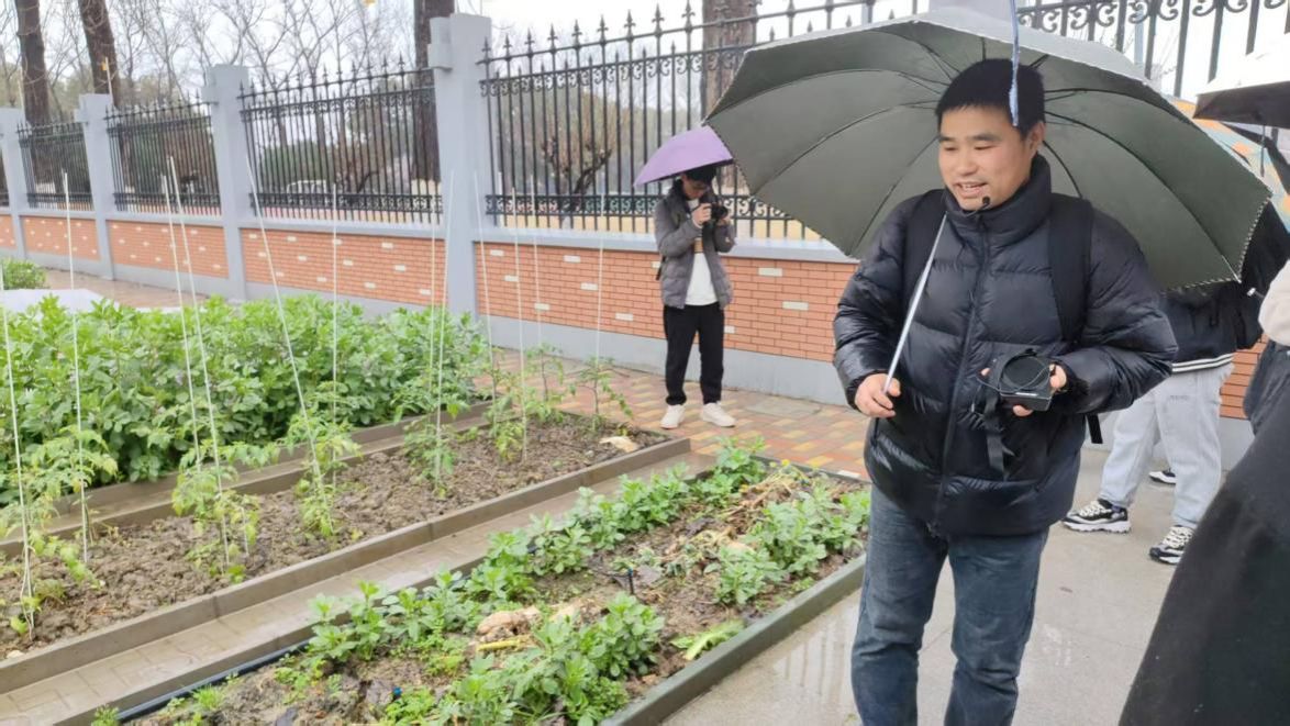 微雨如酥,宁波龙赛中学浸润在一片朦胧的水雾中。首先跟随劳妮妮学姐的脚步,我们开展了龙赛中学的校园探访之旅。步入校园,绿意如潮涌来。淅沥沥的雨滴从叶尖滑落,整个校园沉浸在静谧的学习氛围之中。穿过教学楼,踏过开阔的操场,一片绿意盎然的“田间地头”和一个透明的阳光房豁然展现在眼前,这就是龙赛中学的农创基地。徐皓老师向我们简单介绍了此处基地的来源。劳妮妮学姐告诉我们,此处种植的蔬菜基本上是学生在专业师傅的指导下利用周三下午的活动课时间进行开展的,而在阳光房中也同样是年轻教师们种植的生菜与小番茄。隔壁红色的建筑则是堆放例如铲子、锄头等各种生产工具的房间。穿过长长的走廊,我们来到了一片黄灿灿的油菜花田与石头陈列展前,劳妮妮学姐表示,此处各种类的岩石皆是来自不同的地区,其中黑色气孔构造的为玄武岩。而隔壁油菜花田的花籽则可以真的做成菜籽油。除此之外,还有许多小块的田地种植如胡萝卜、白萝卜等蔬果。