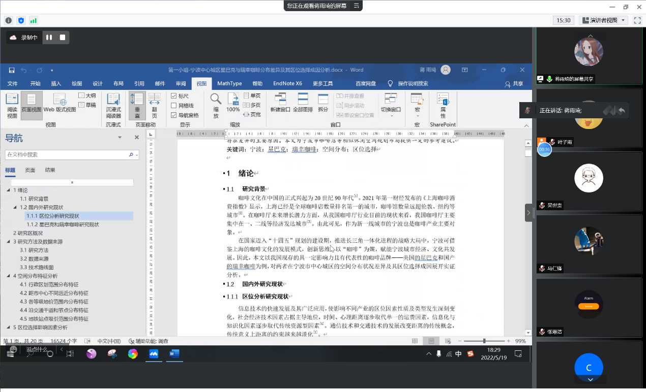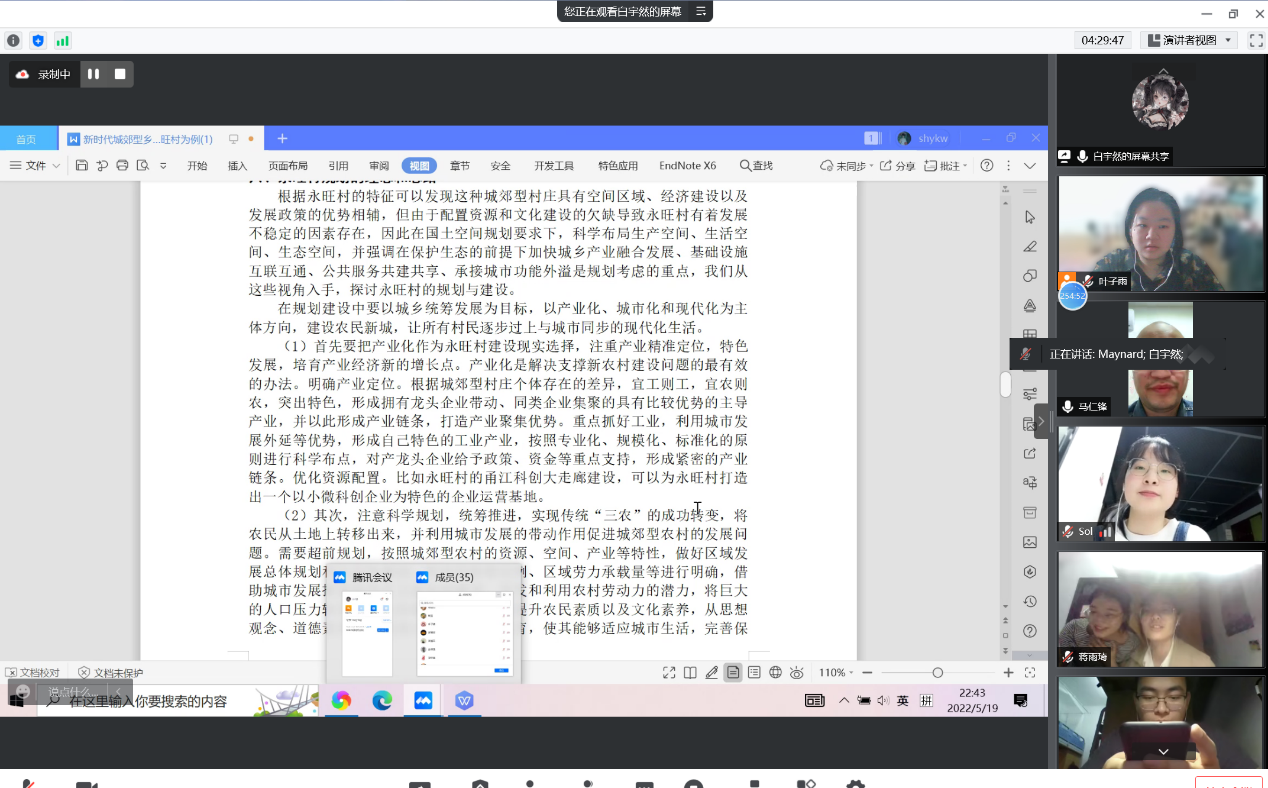 2022年5月19日18:30至22:30,在任课教师马仁锋主持下,2019级地理科学(师范)专业的同学们进行《人文地理野外综合实习》课程小组大作业的线上汇报,为持续三个月的人文地理野外综合实习课程进行总结与评比。