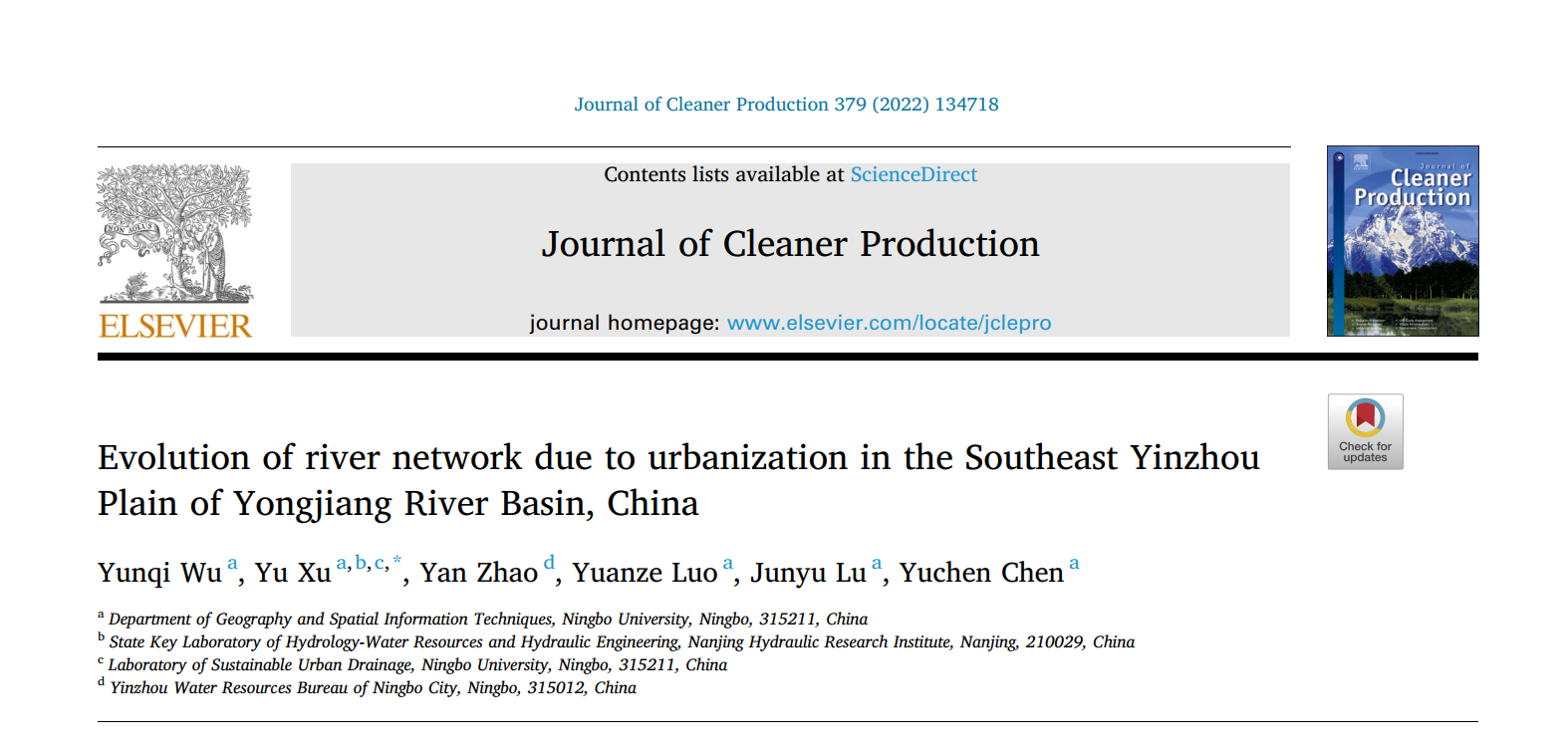 2020级地理科学(师范)专业本科生吴云琦以第一作者身份在《Journal of Cleaner Production》期刊(一区TOP,IF=11.072)发表了题为“Evolution of river network due to urbanization in the Southeast Yinzhou Plain of Yongjiang River Basin, China”的学术论文(论文链接//www.sciencedirect.com/science/article/pii/S0959652622042901?via%3Dihub)。通讯作者为国产探花