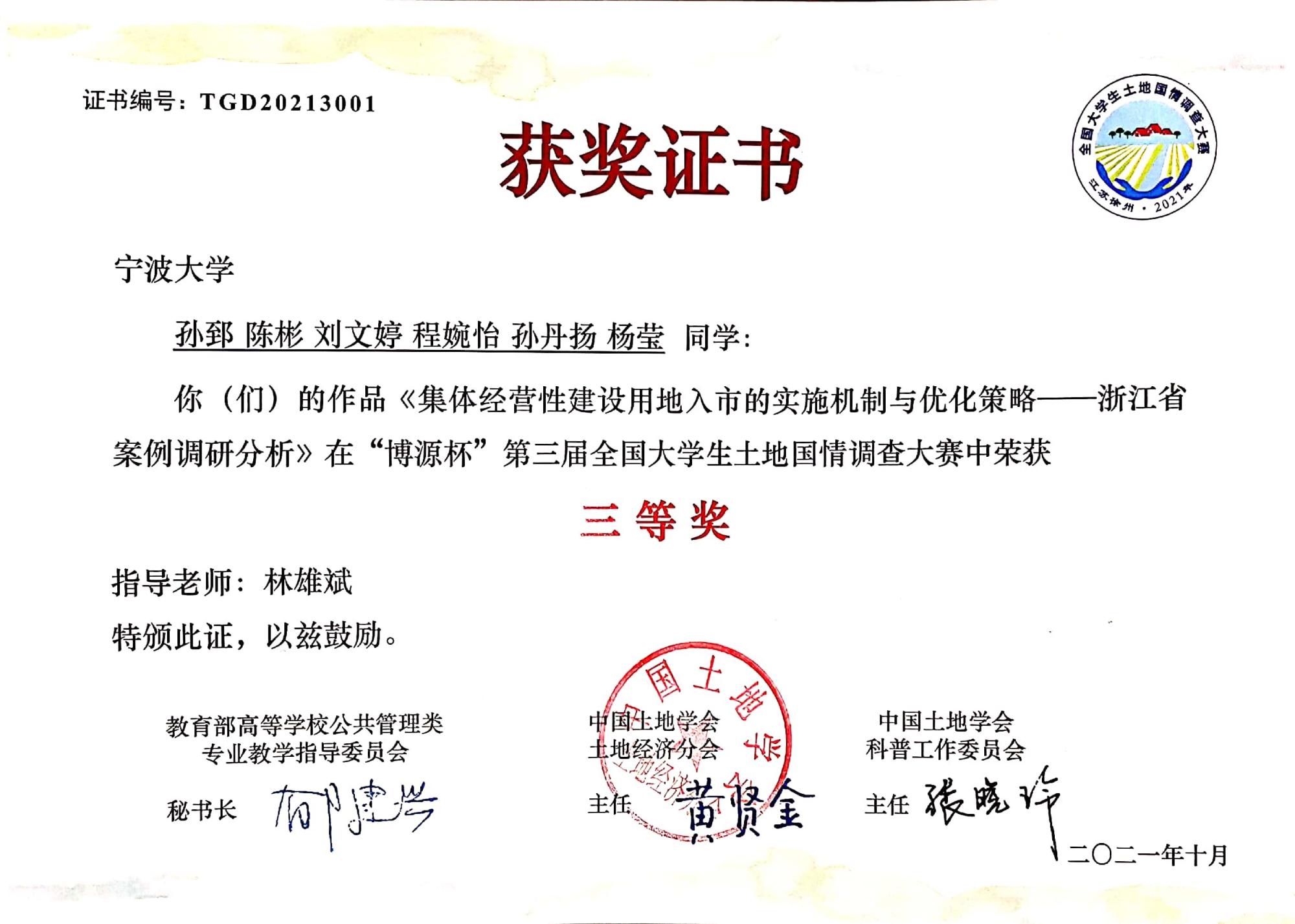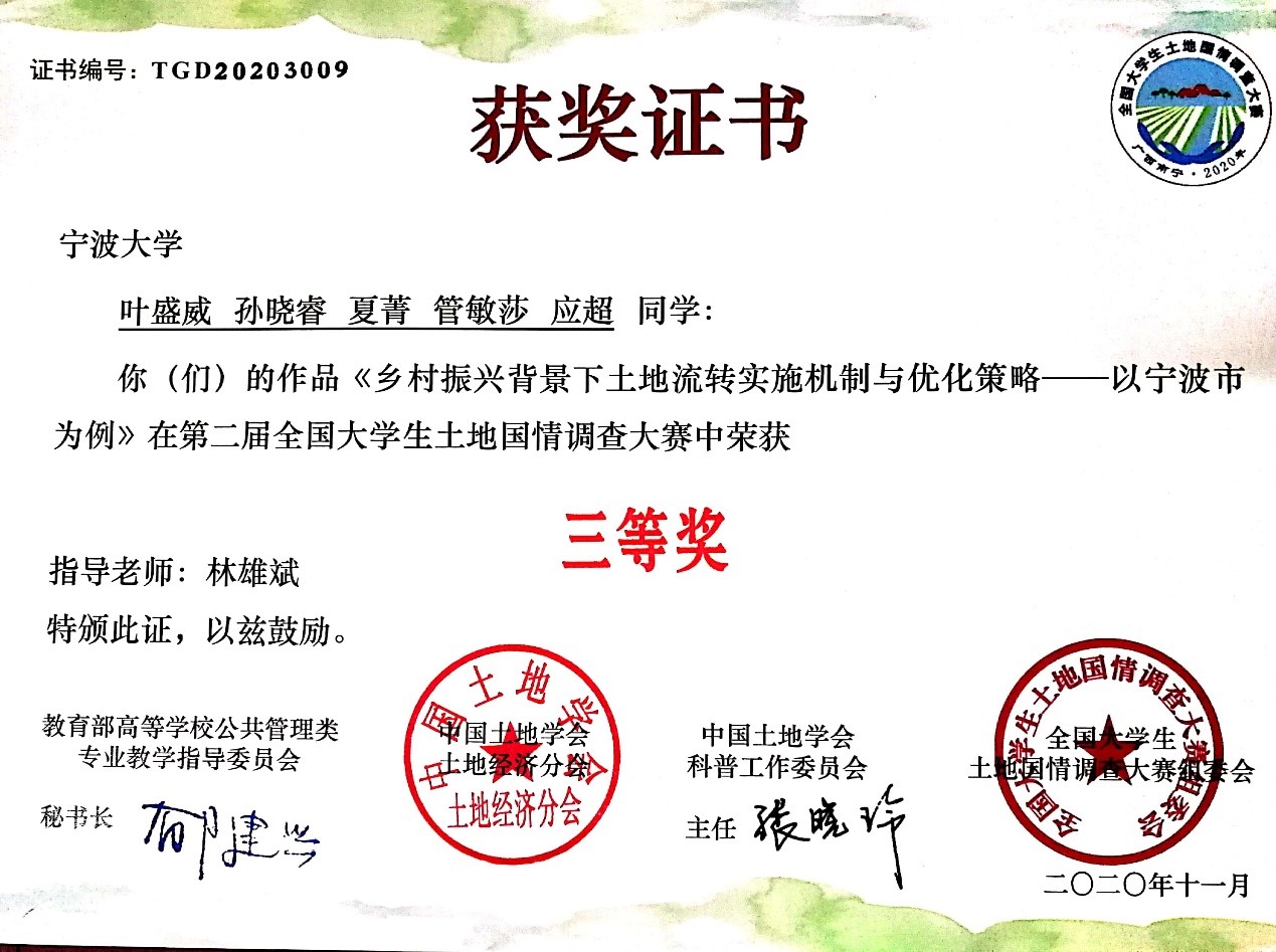 图 4 第二届全国大学生土地国情调查大赛三等奖