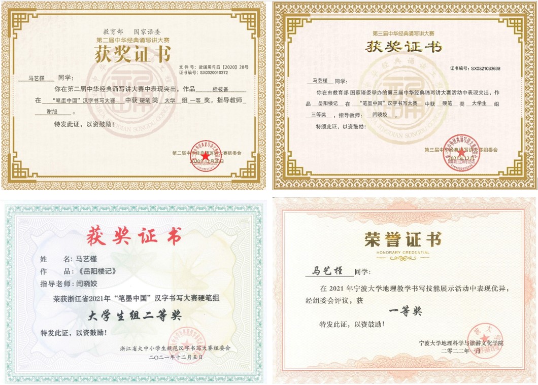 地理科学(师范)专业学生在地理教育方向徐皓副教授、曹罗丹讲师等专业教师培养下多次斩获佳绩,专业教学技能得到有效提升。地理系积极探索与全市中学开展协同育人,共同助力地理科学(师范)学生的成长。在学院老师与宁波市名师骆海军老师、张小肖老师的共同指导下,学子们连续三年在长三角师范生教学基本功大赛中取得优异成绩,获得一等奖2项、三等奖1项;荣获浙江省师范生教学技能竞赛二等奖、三等奖各一项;“笔墨中国”汉字书写大赛中硬笔类大学组一等奖2项,浙江省大学组二等奖1项。经过教学技能的培养,地理科学(师范)专业涌现出大批优秀学子, 2017级地理科学(师范)班张悦同学、2018级地理科学(师范)班徐浩和王玉育同学、2019级地理科学(师范)班杨莹同学经过层层选拔,以过硬的专业实力分别入选国产探花