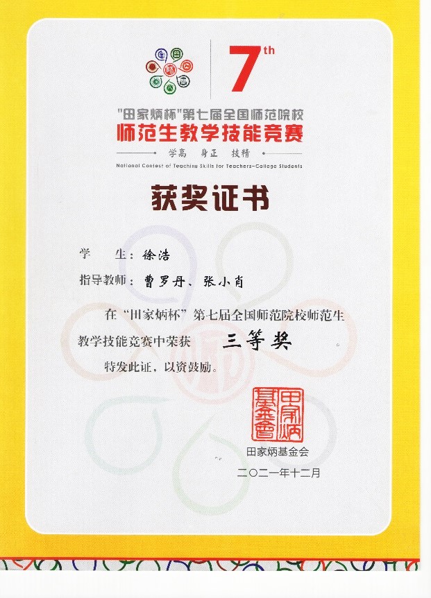 6. “田家炳杯”第七届全国师范院校师范生教学技能竞赛 三等奖