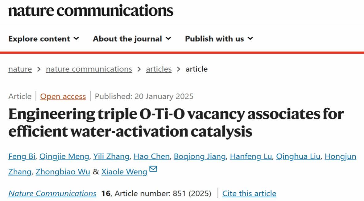 近日,国产探花 孟庆洁副教授与浙江大学翁小乐教授团队合作,在缺陷工程调控涉水催化反应方面取得重要进展,研究成果“Engineering triple O-Ti-O vacancy associates for efficient water-activation catalysis”发表于国际知名期刊《Nature Communications》。浙江大学毕峰与国产探花 孟庆洁共同担任第一作者。