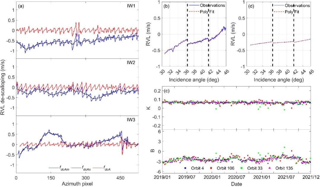 海表流场是海洋环流、物质输运与气候过程的关键变量,对航运、渔业与海洋能开发等具有重要应用价值。合成孔径雷达(SAR)基于多普勒质心异常(DCA)可从单天线平台获取径向表面流速,但现有Sentinel-1 IW Level-2 RVL产品中存在明显的非地球物理项(如scalloping、姿态与天线指向误差)和风—波诱导伪速度(WASV),这会掩盖真实流场信号。